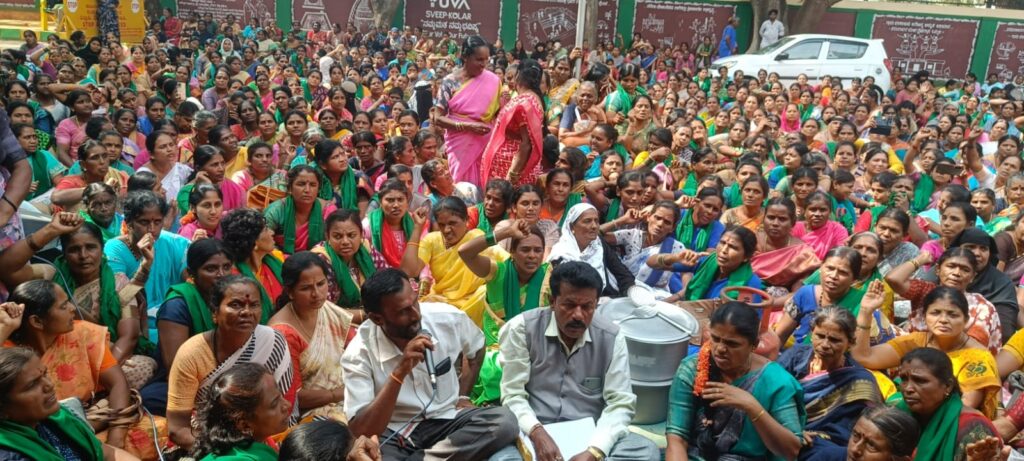ಕೋಲಾರ: ಕೇಂದ್ರ ಮತ್ತು ರಾಜ್ಯ ಸರ್ಕಾರಗಳ ಬಜೆಟ್ ನಲ್ಲಿ ಬಿಸಿಯೂಟ ನೌಕರರ ಕನಿಷ್ಠ ವೇತನವನ್ನು 10500 ರೂಗಳಿಗೆ ಹೆಚ್ಚಳ ಮಾಡುವಂತೆ ಹಾಗೂ ಹಲವಾರು ಬೇಡಿಕೆಗಳನ್ನು ಈಡೇರಿಸುವಂತೆ ಒತ್ತಾಯಿಸಿ ಮಂಗಳವಾರ ಕೋಲಾರ ನಗರದ ನಚಿಕೇತನ ನಿಲಯದಿಂದ ಜಿಲ್ಲಾ ಪಂಚಾಯತಿವರೆಗೆ ಪ್ರತಿಭಟನಾ ಮೆರವಣಿಗೆ ಮೂಲಕ ತೆರಳಿ ಮುತ್ತಿಗೆ ಹಾಕಿ ಮುಖ್ಯ ಮಂತ್ರಿಗಳಿಗೆ, ಉಪ ಮುಖ್ಯ ಮಂತ್ರಿಗಳಿಗೆ, ಸಚಿವರಿಗೆ ಹಾಗೂ ಕೇಂದ್ರ ಸರ್ಕಾರಕ್ಕೆ ಜಿಲ್ಲಾ ಪಂಚಾಯತಿ ಮುಖ್ಯ ಕಾರ್ಯ ನಿರ್ವಹಣಾಧಿಕಾರಿಗಳ ಮೂಲಕ ಮನವಿ ಸಲ್ಲಿಸಲಾಯಿತು.